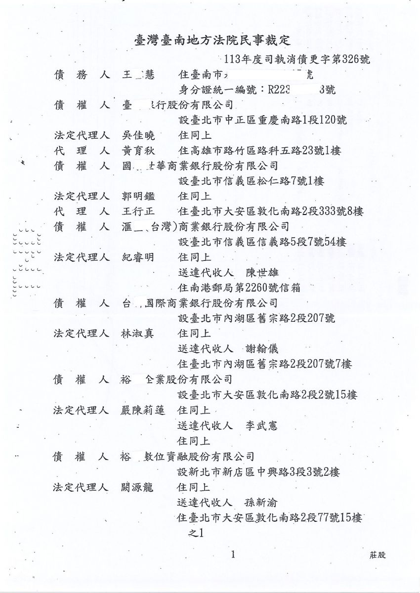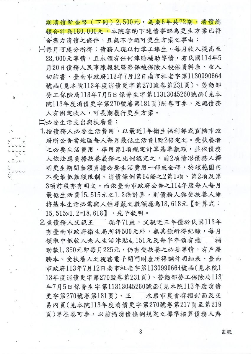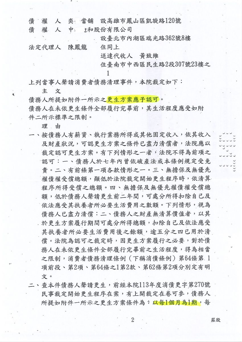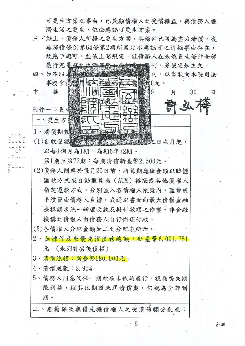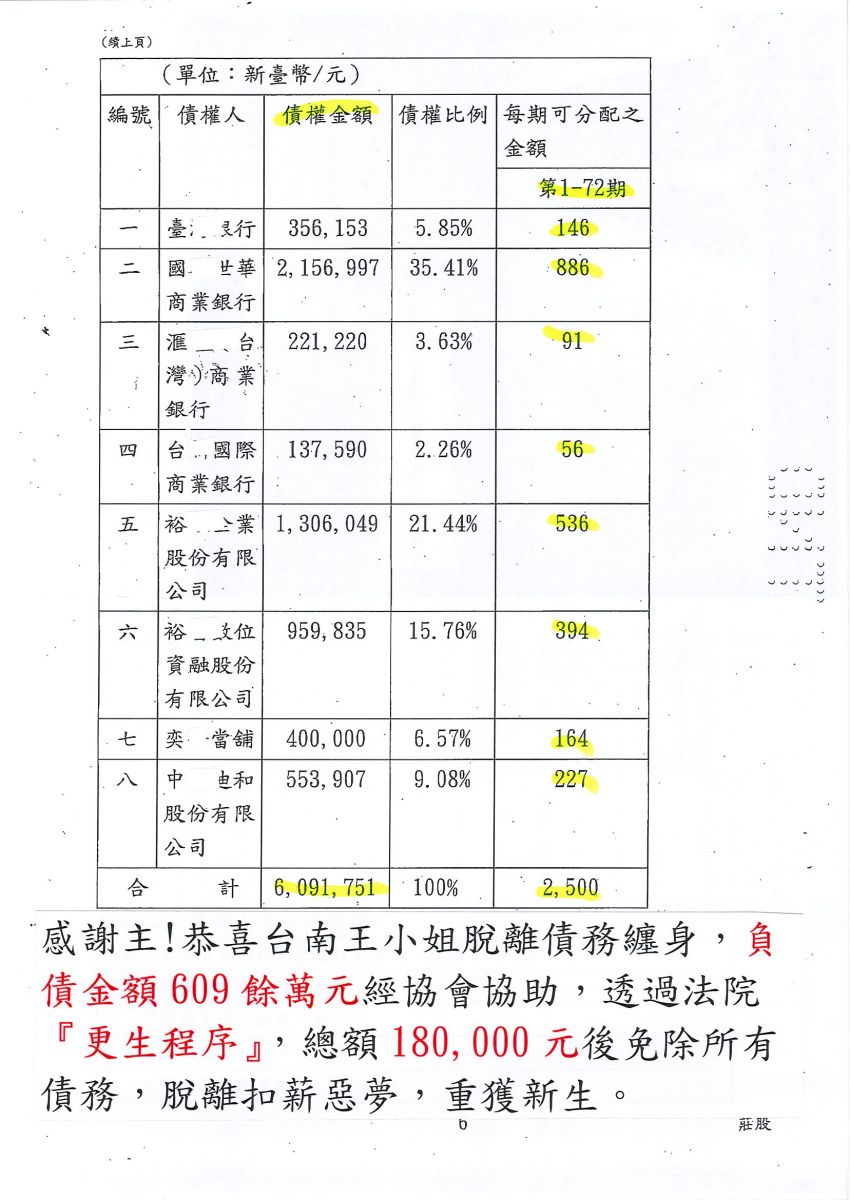 狂賀本會會員 王小姐 經法院裁定更生方案認可確定,以180,000元