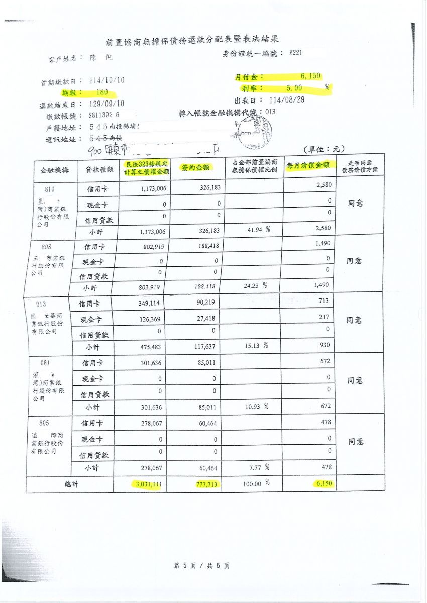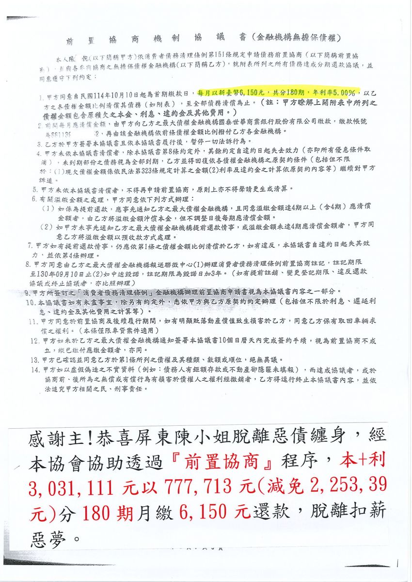 經協會協助後,經前置協商後核准!! 分180期,月繳6,150元,免除扣薪噩夢