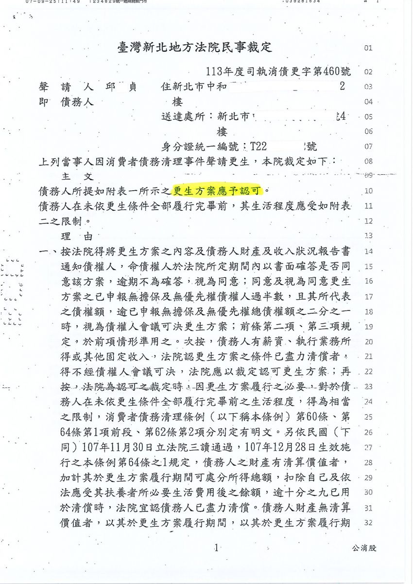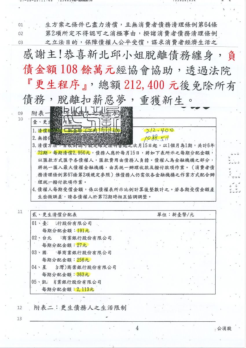 狂賀本會會員 邱小姐 經法院裁定更生方案認可確定,以212,400元