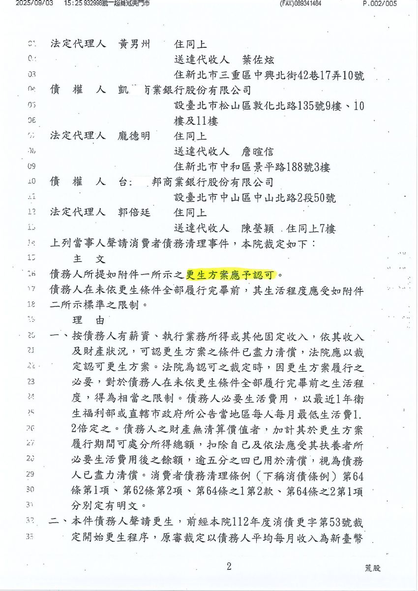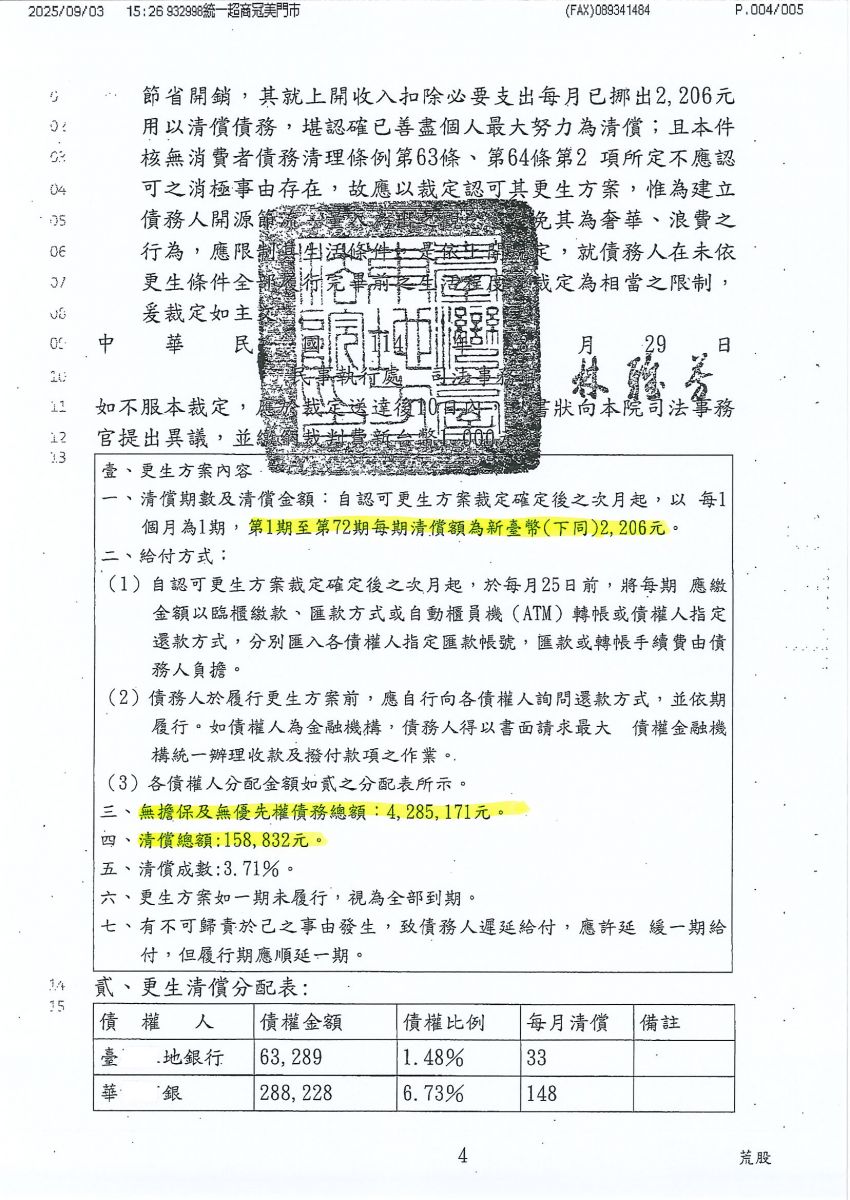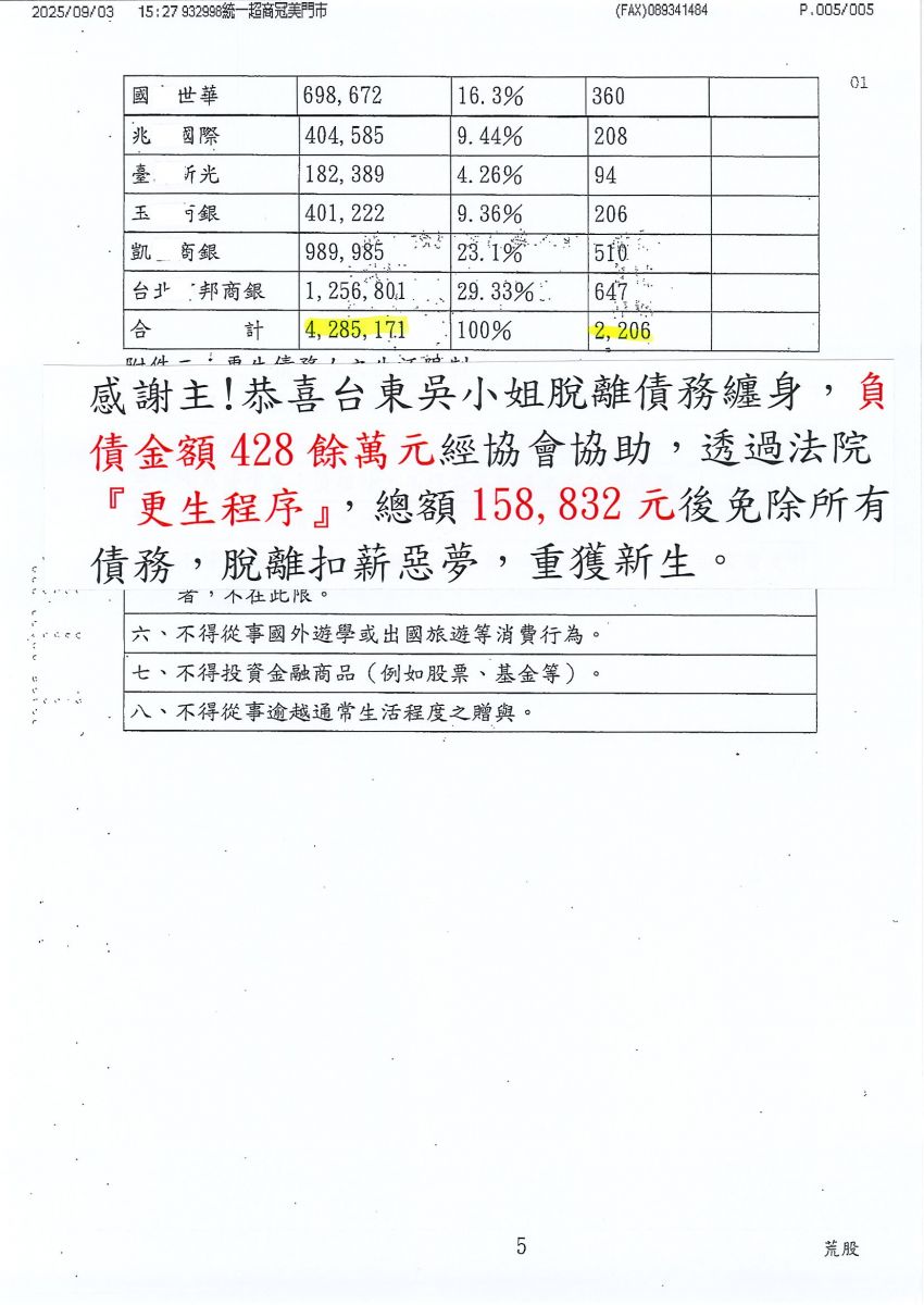 狂賀本會會員 吳小姐 經法院裁定更生方案認可確定,以158,832元