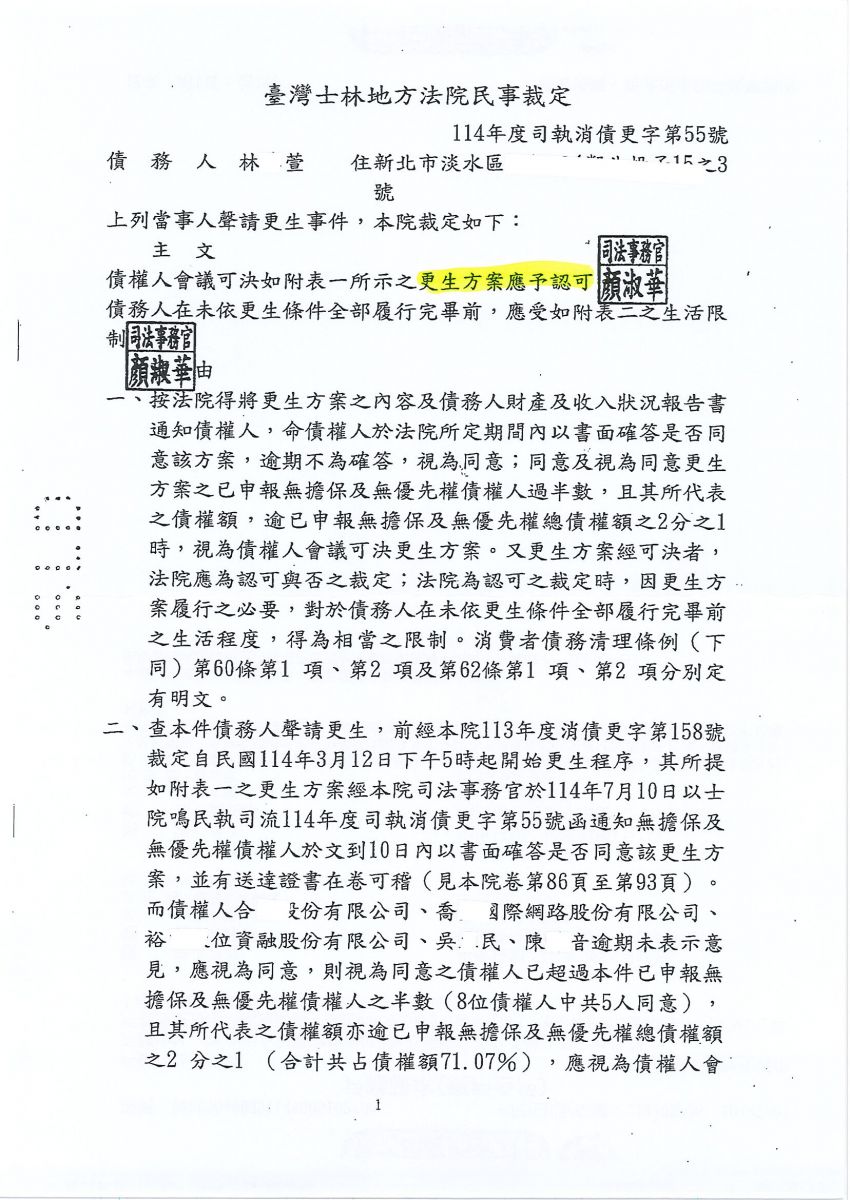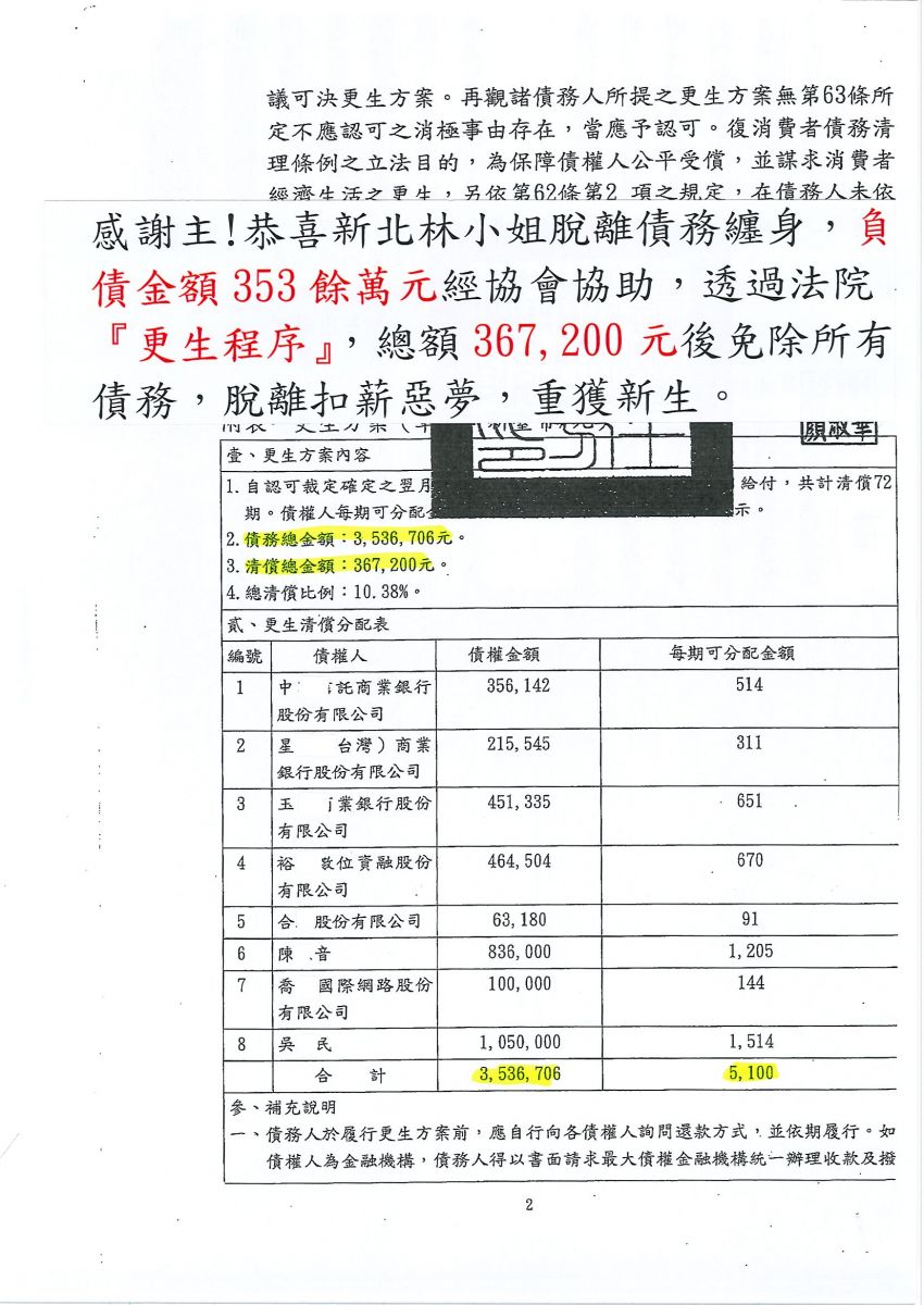 狂賀本會會員 林小姐 經法院裁定更生方案認可確定,以367,200元