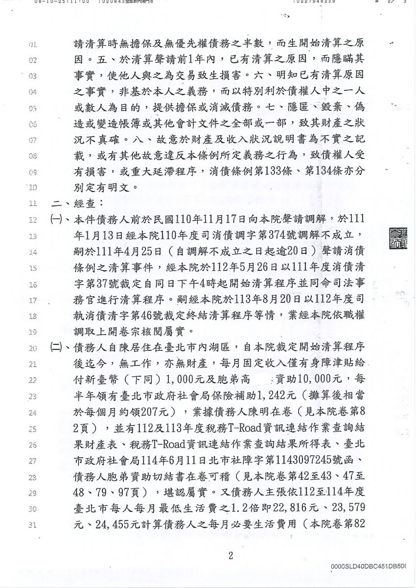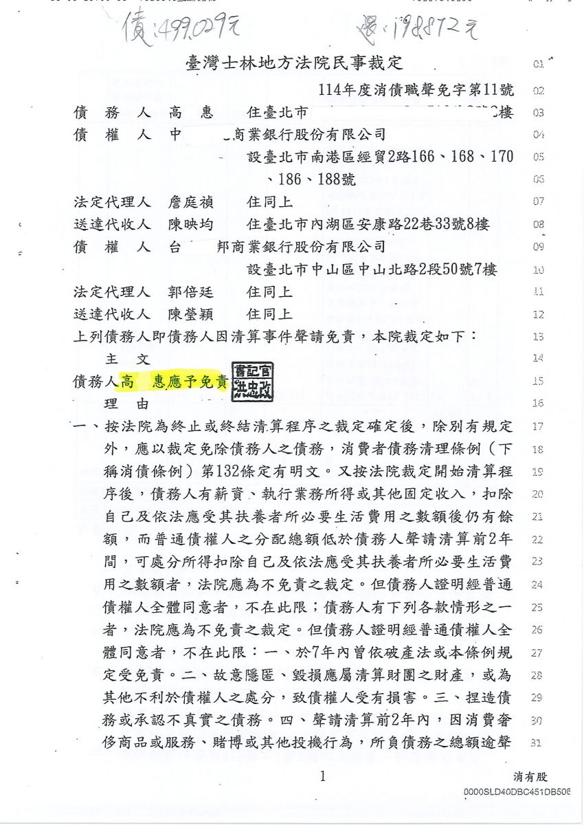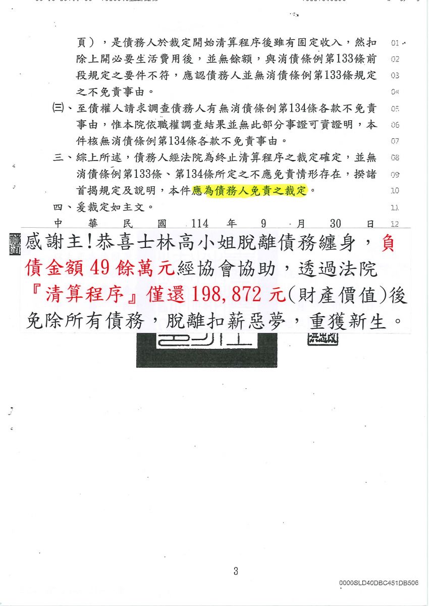 狂賀本會會員 高小姐 經法院裁定清算免責認可確定,以198,872元