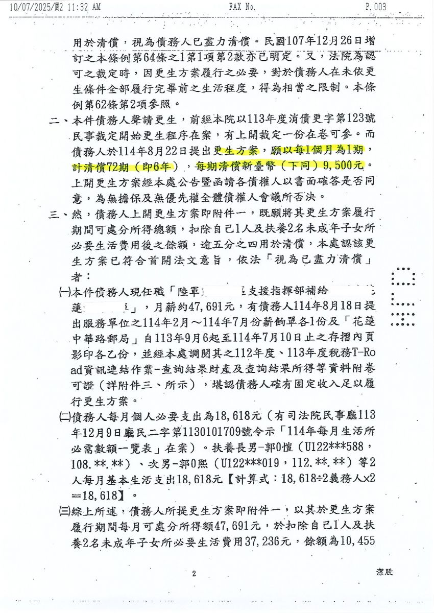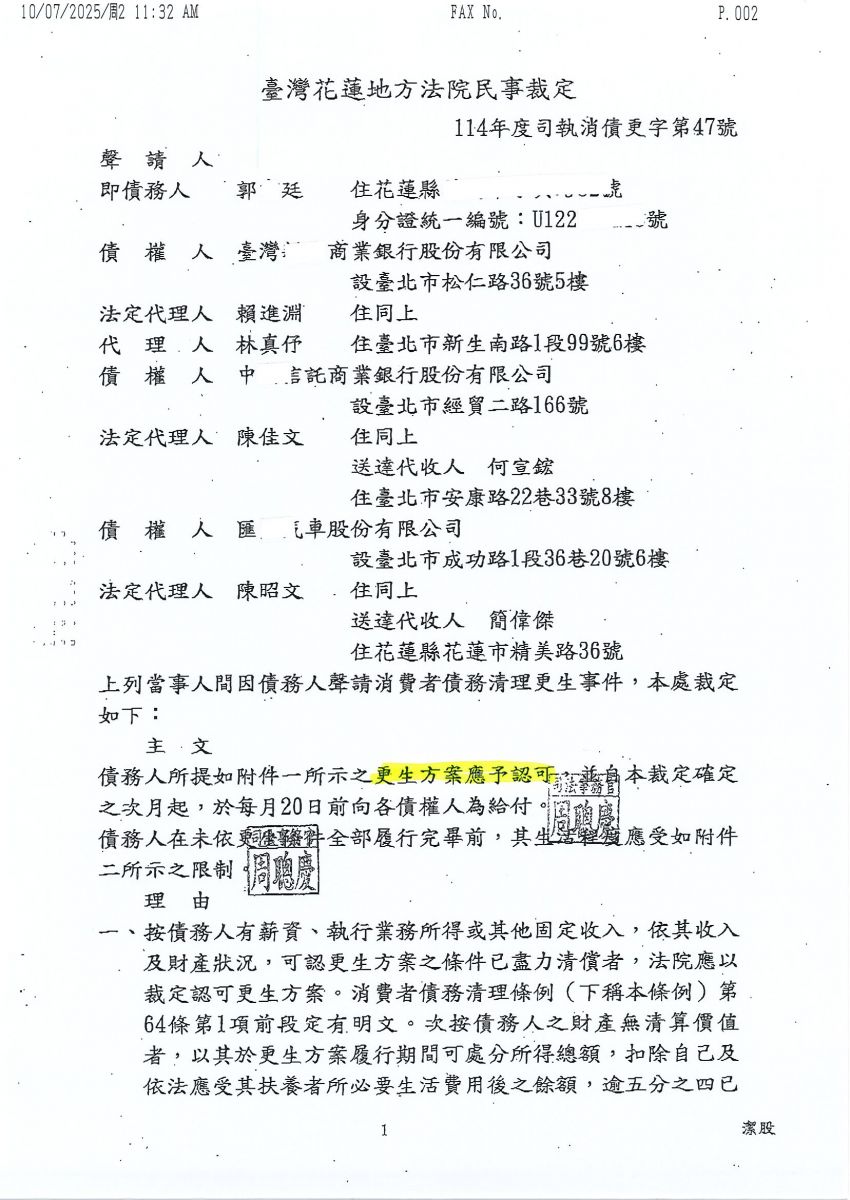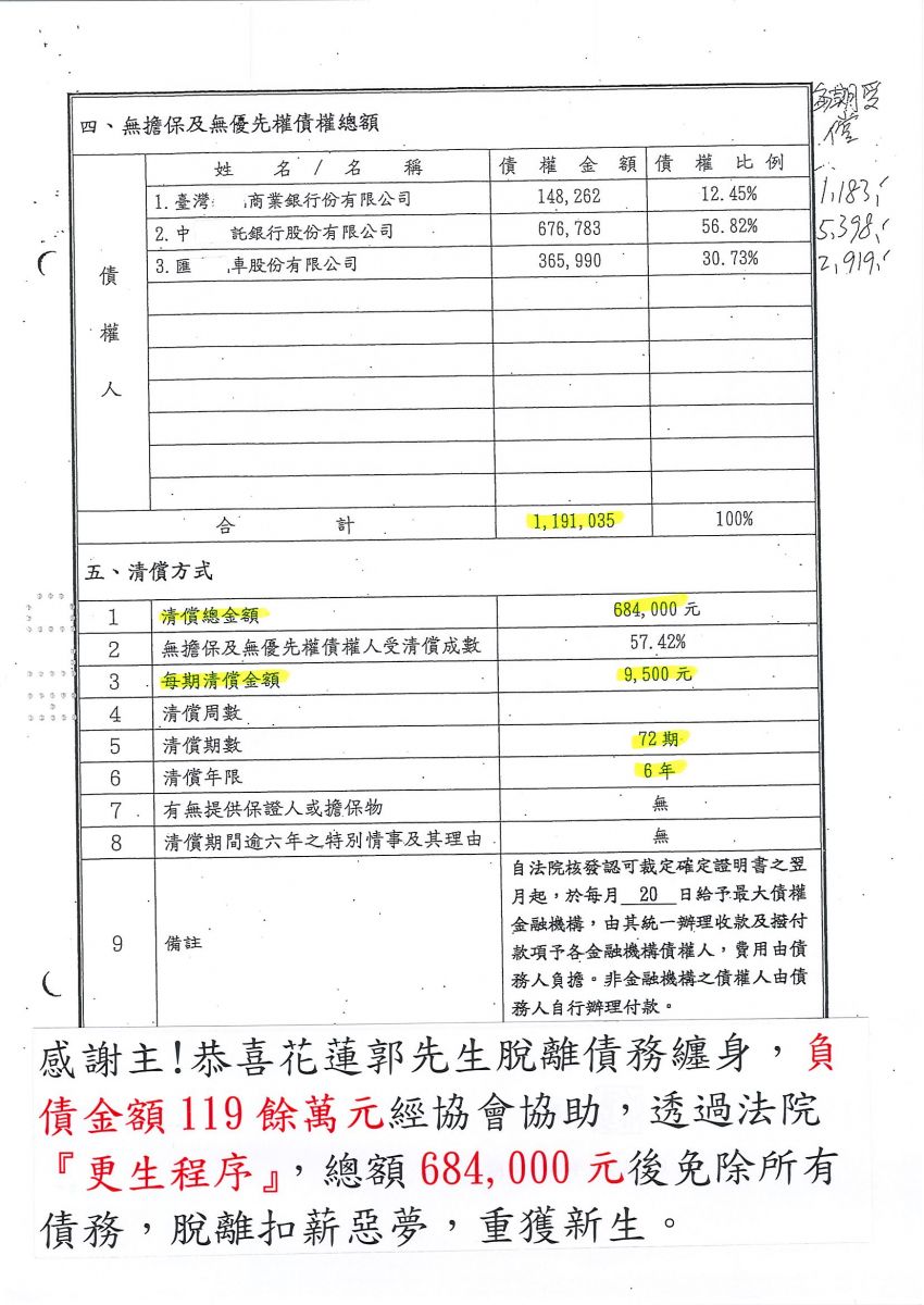 狂賀本會會員 郭先生 經法院裁定更生方案認可確定,以684,000元