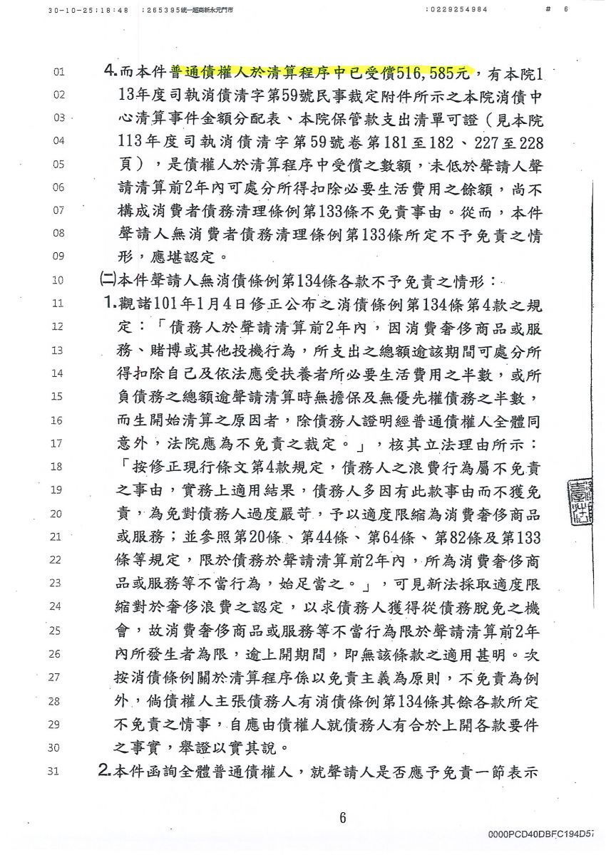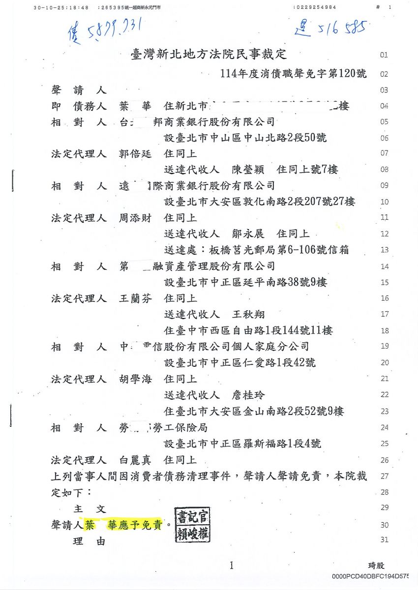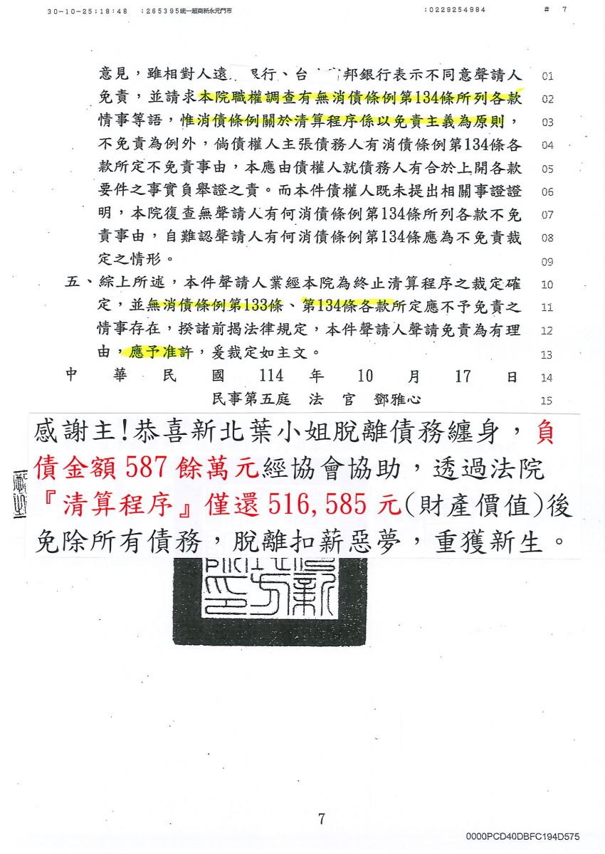 狂賀本會會員 葉小姐 經法院裁定清算免責認可確定,以516,585元