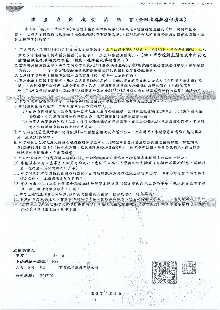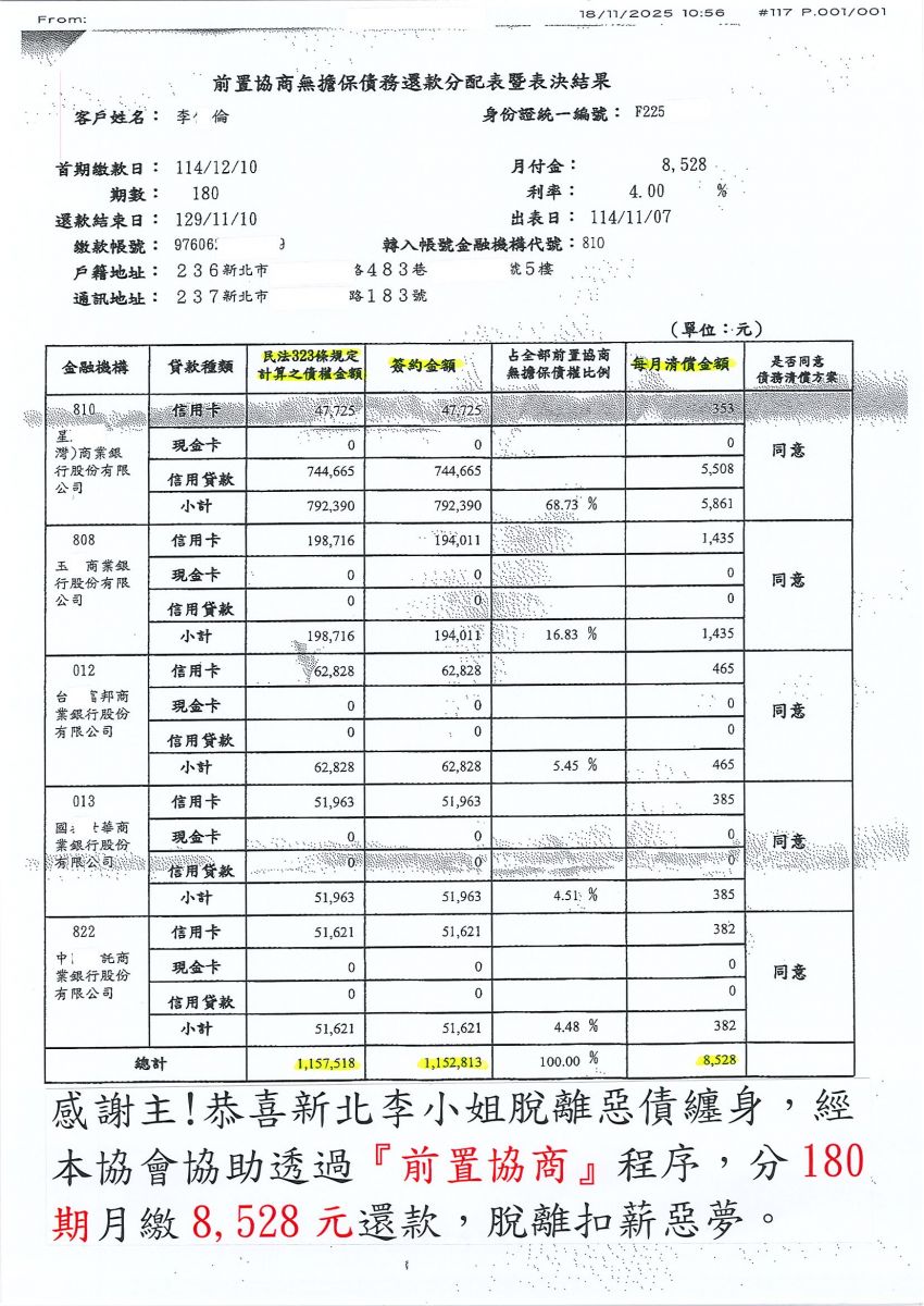 經協會協助後,經前置協商後核准!! 分180期,月繳8,528元,免除扣薪噩夢