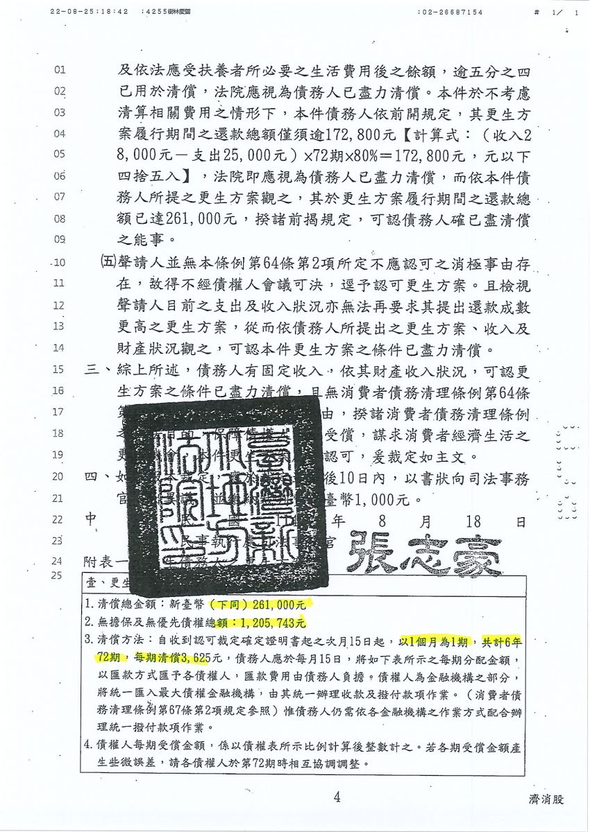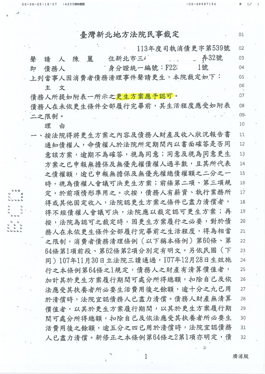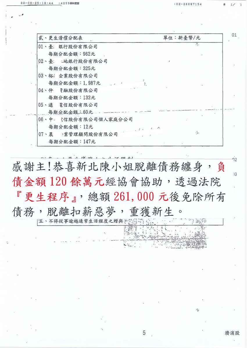 狂賀本會會員 陳小姐 經法院裁定更生方案認可確定,以261,000元