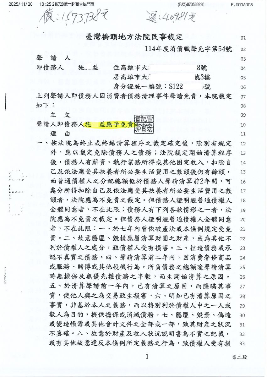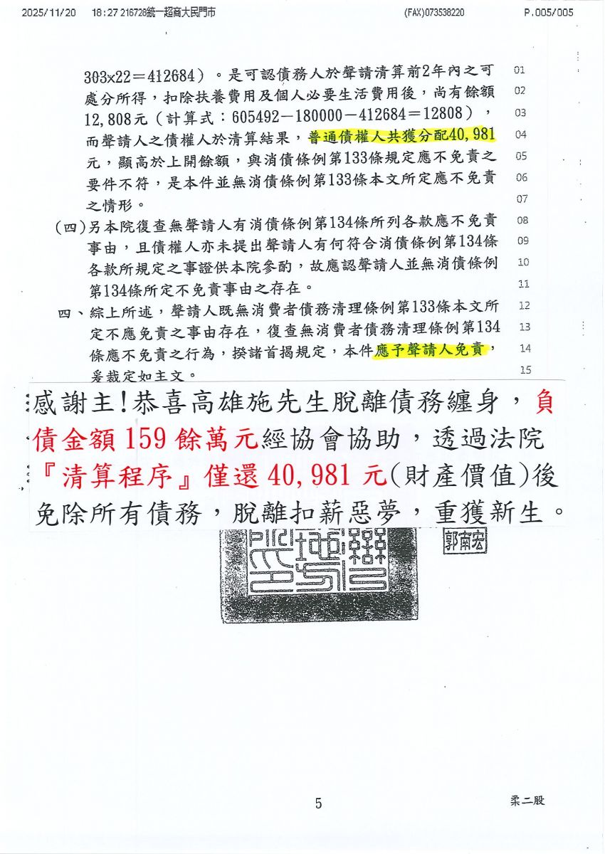 狂賀本會會員 施先生 經法院裁定清算免責認可確定,以40,981元