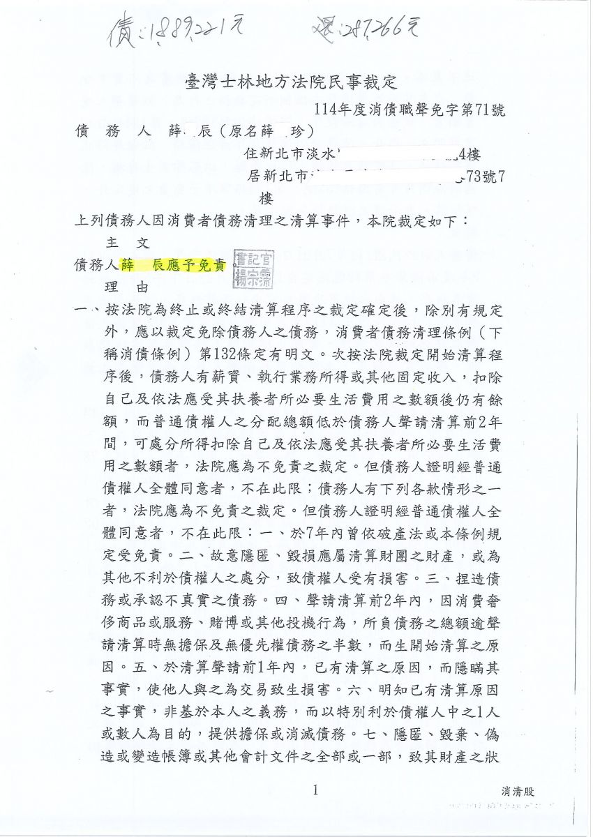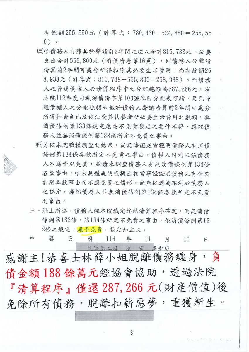 狂賀本會會員 薛小姐 經法院裁定清算免責認可確定,以287,266元