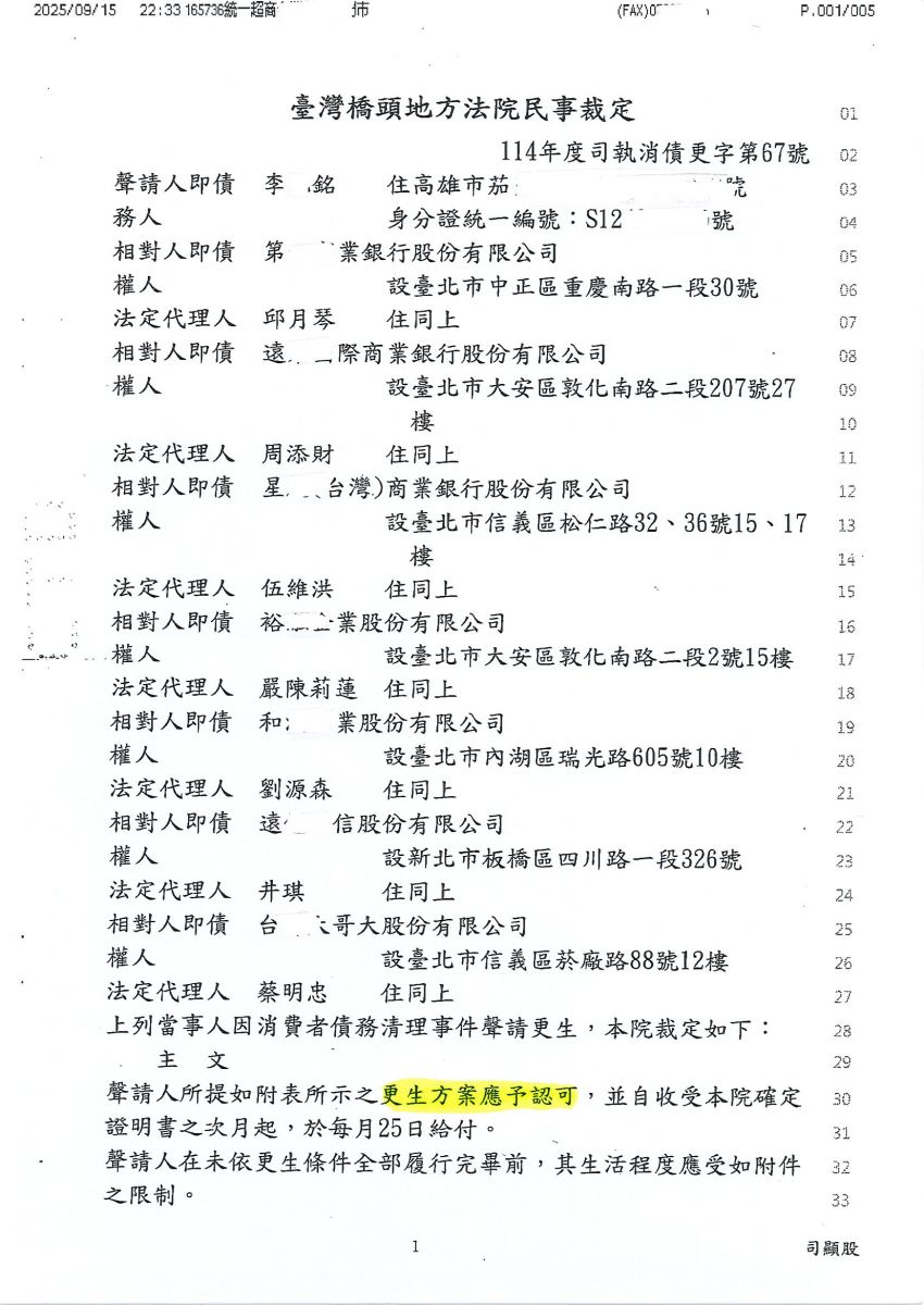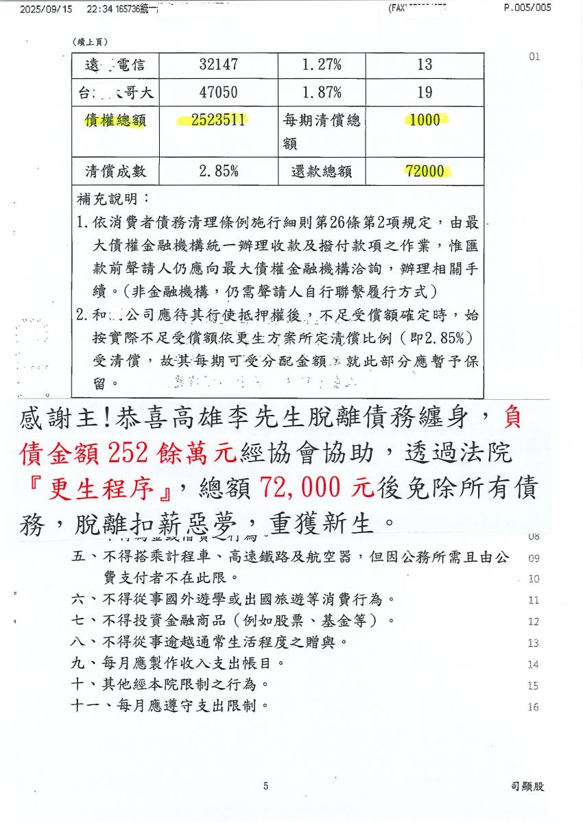狂賀本會會員 李先生 經法院裁定更生方案認可確定,以72,000元