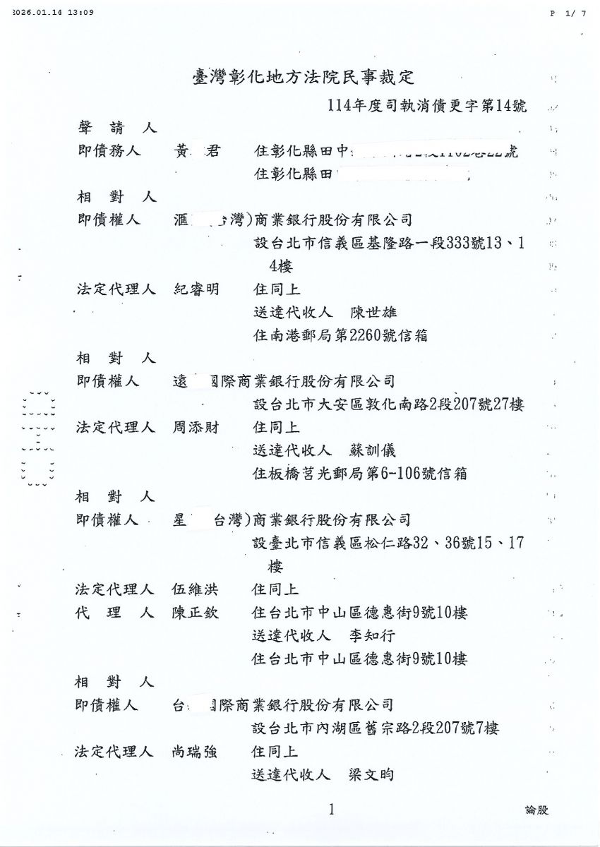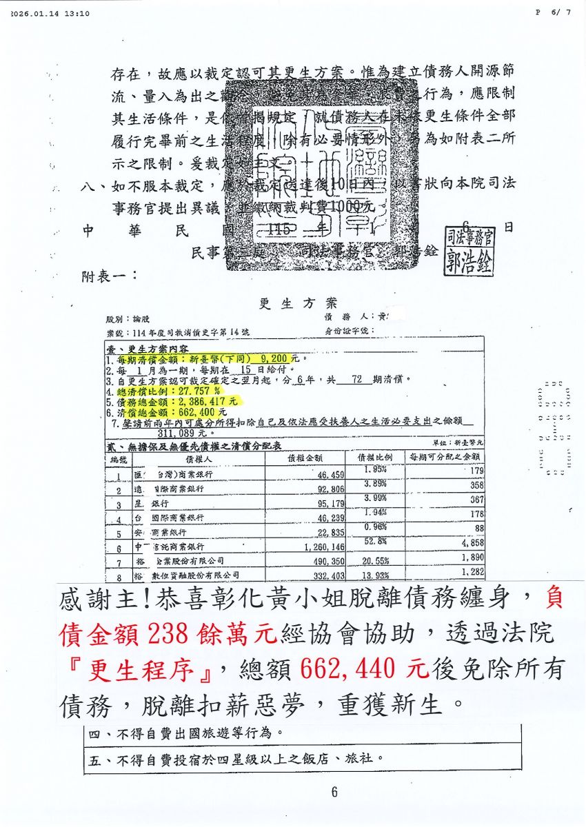 狂賀本會會員 黃小姐 經法院裁定更生方案認可確定,以662,440元
