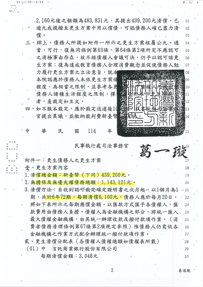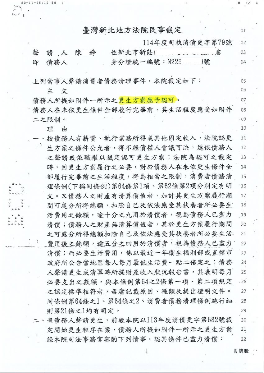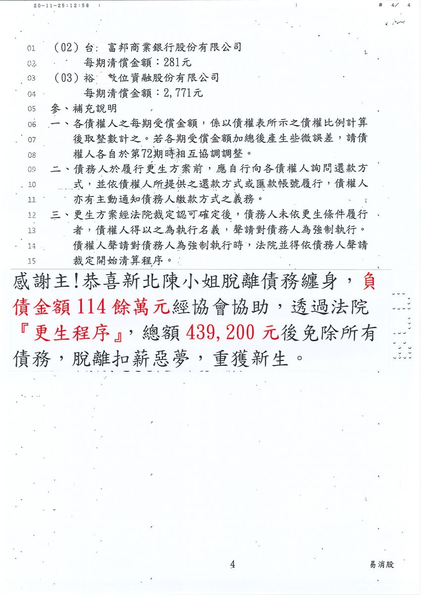 狂賀本會會員 陳小姐 經法院裁定更生方案認可確定,以439,200元