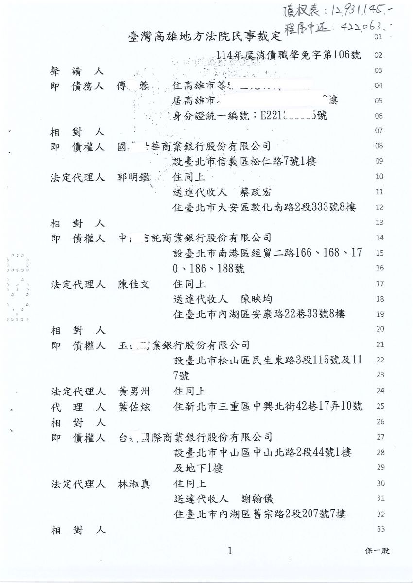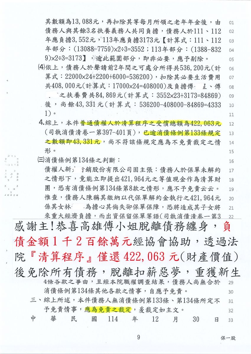 狂賀本會會員 傅小姐 經法院裁定清算免責認可確定,以422,063元
