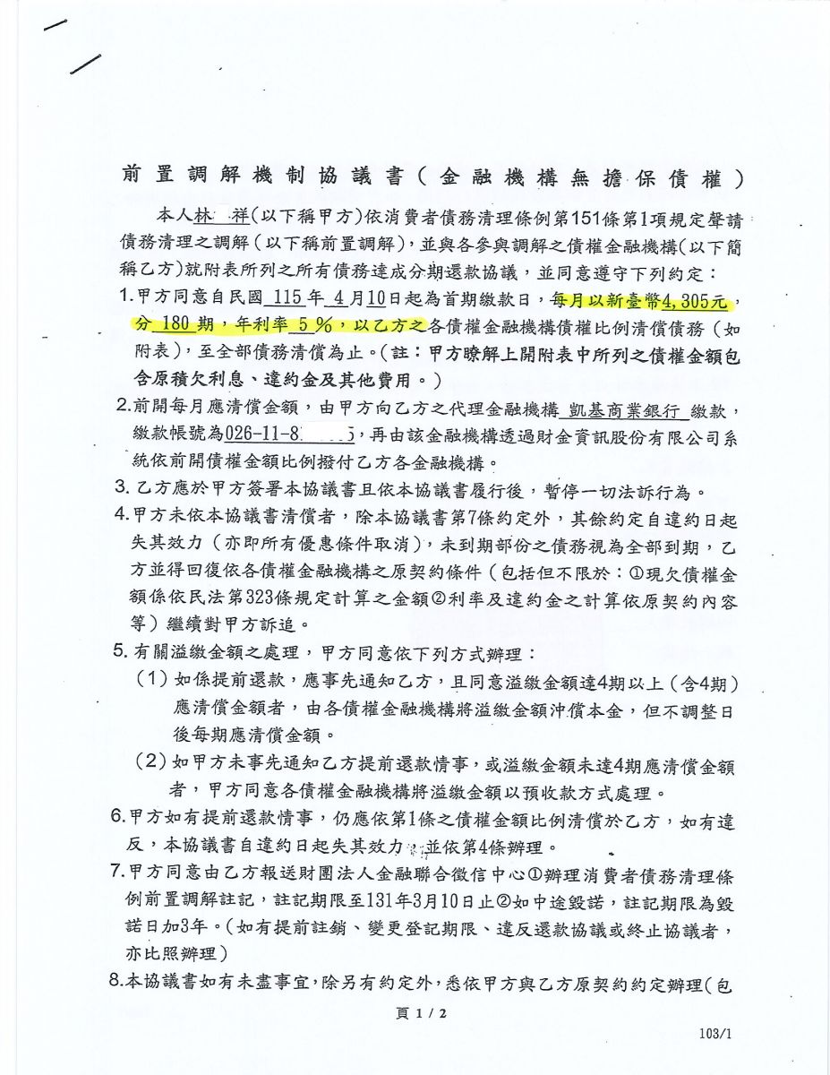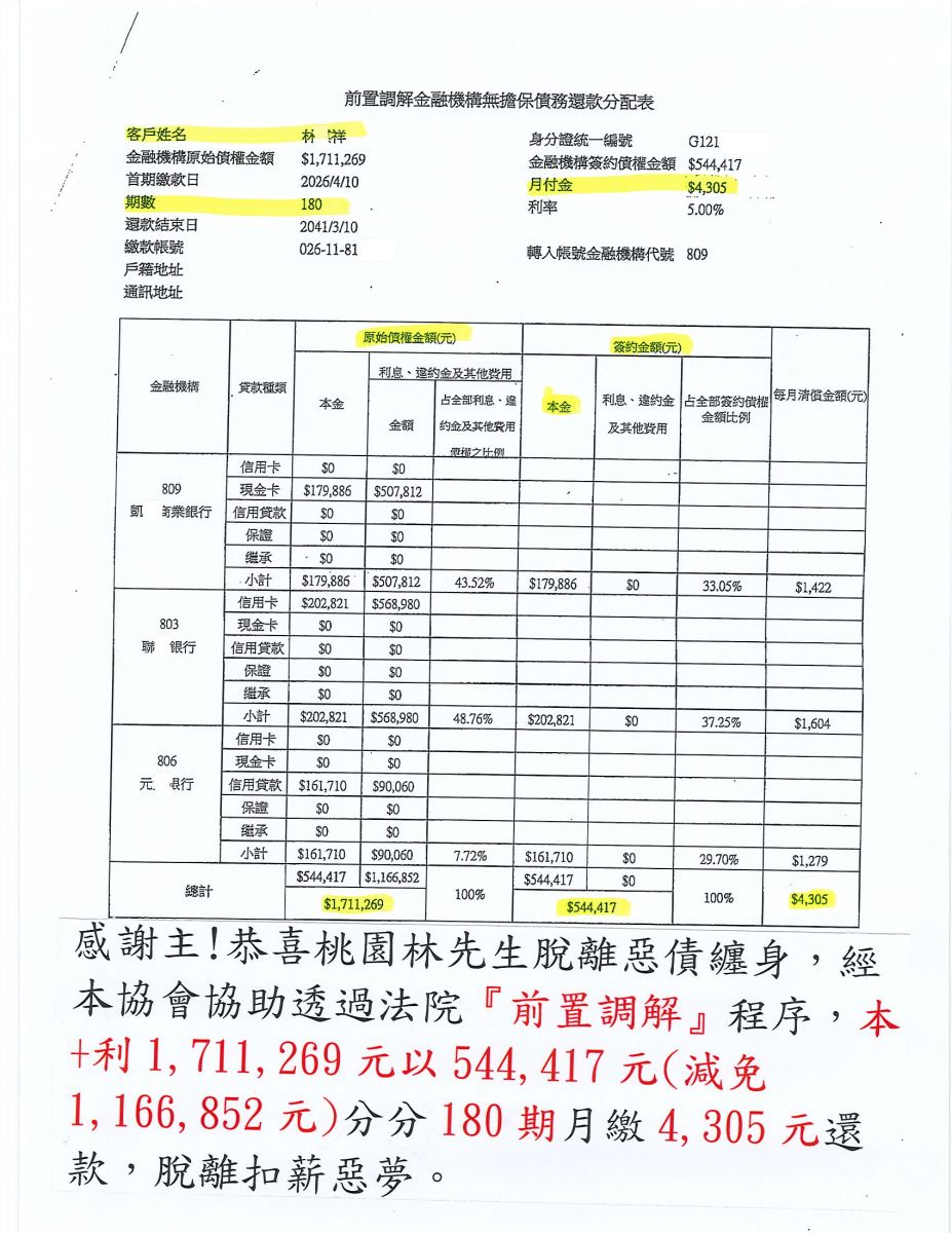 經協會協助後,經法院前置調解後核准!! 分180期,月繳4,305元,減免100多萬利息,免除扣薪噩夢