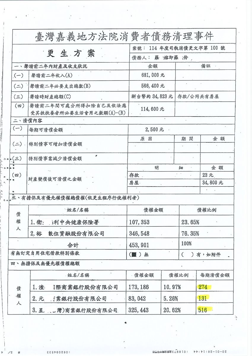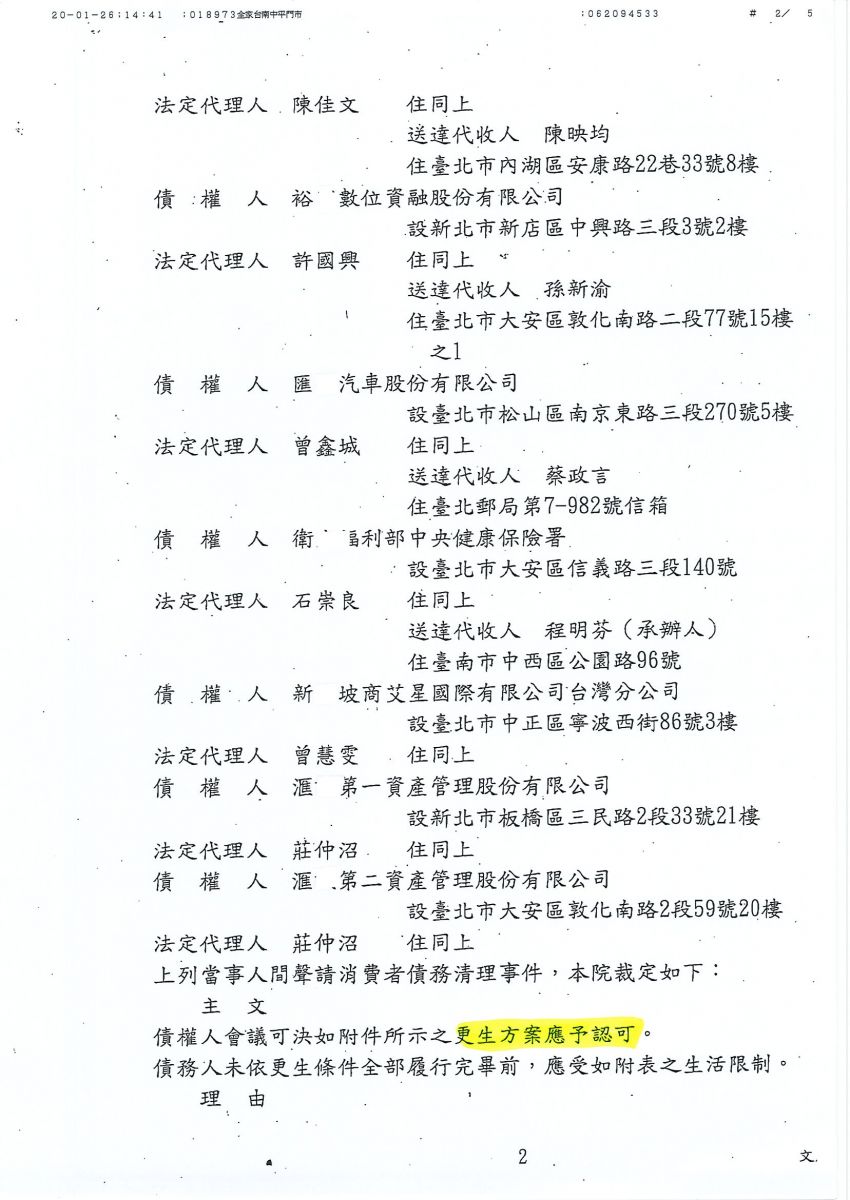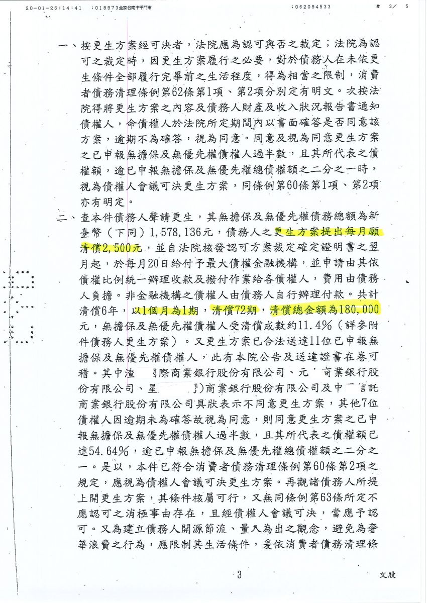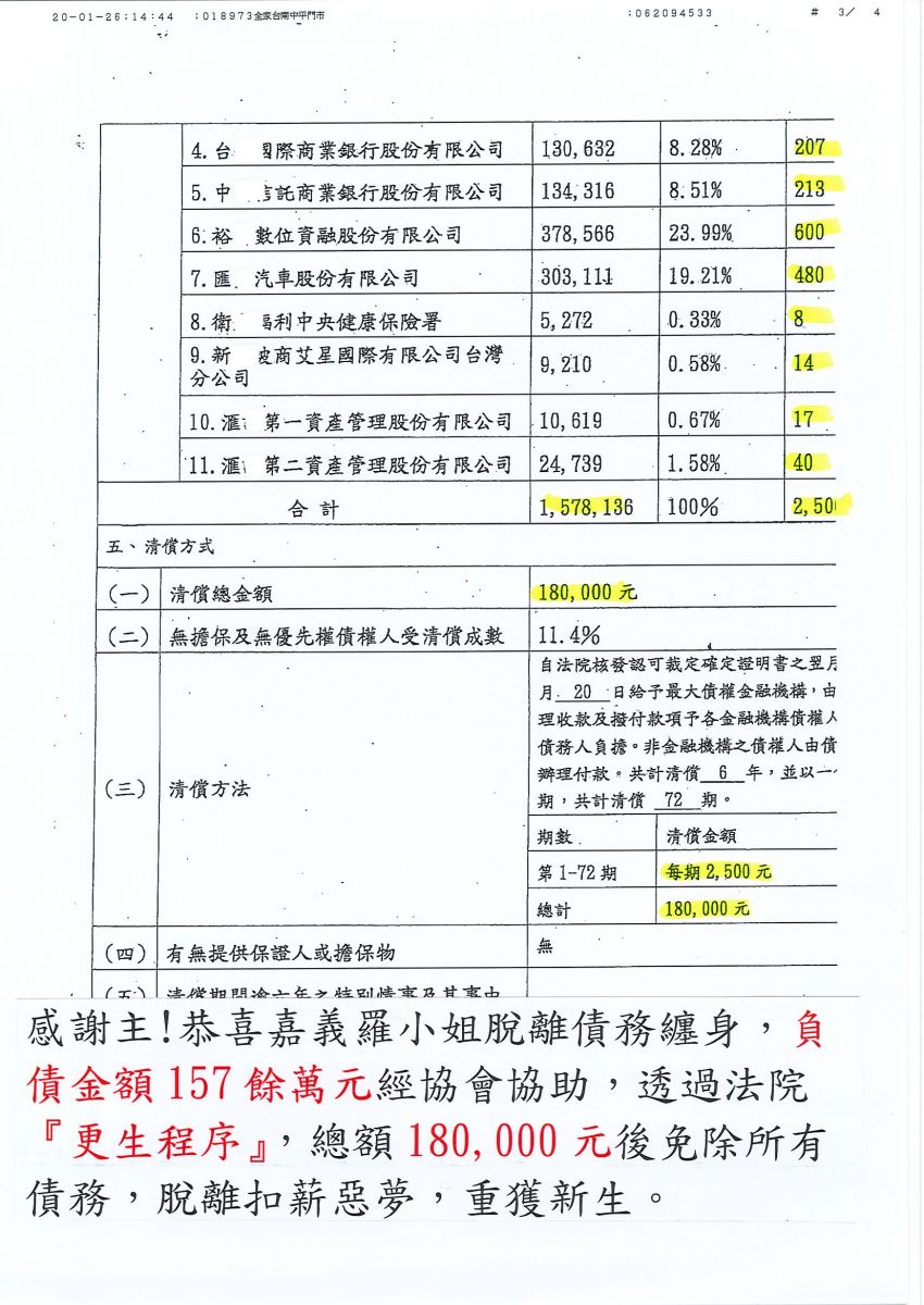 狂賀本會會員 羅小姐 經法院裁定更生方案認可確定,以180,000元