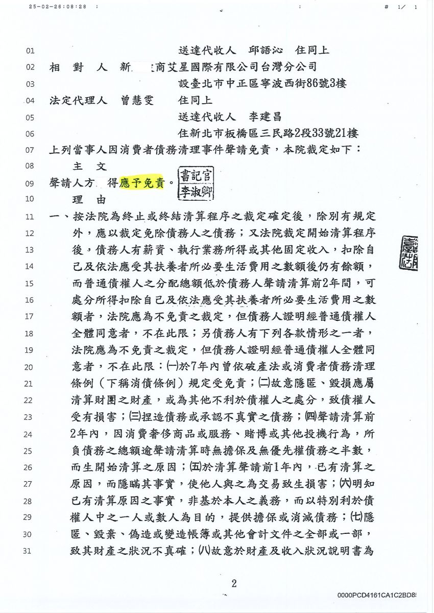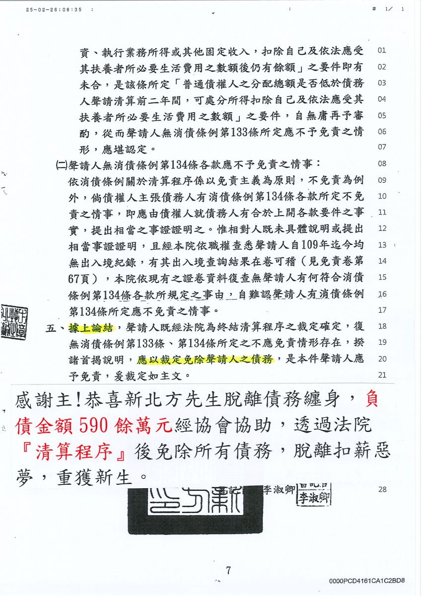 清算免責成功-新北地方法院-114年度消債聲免字第227號