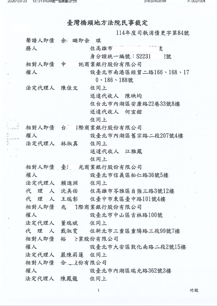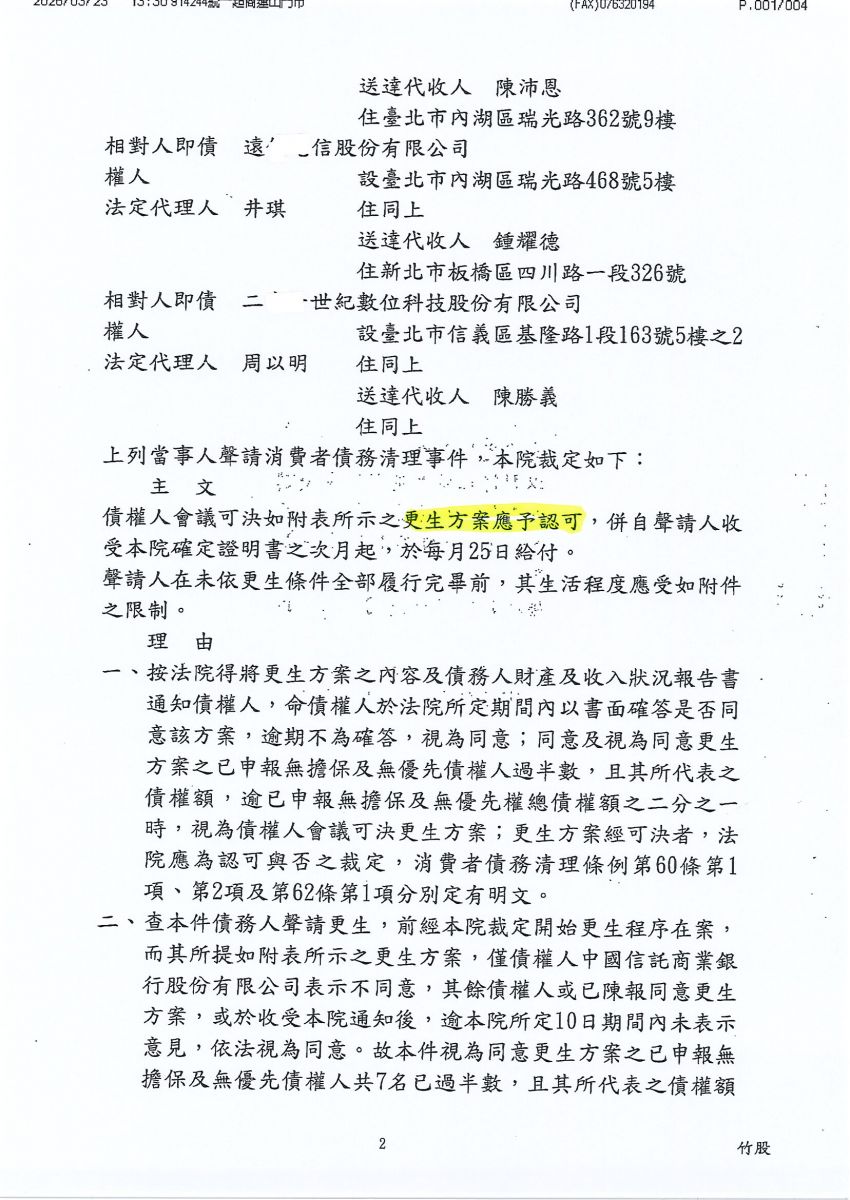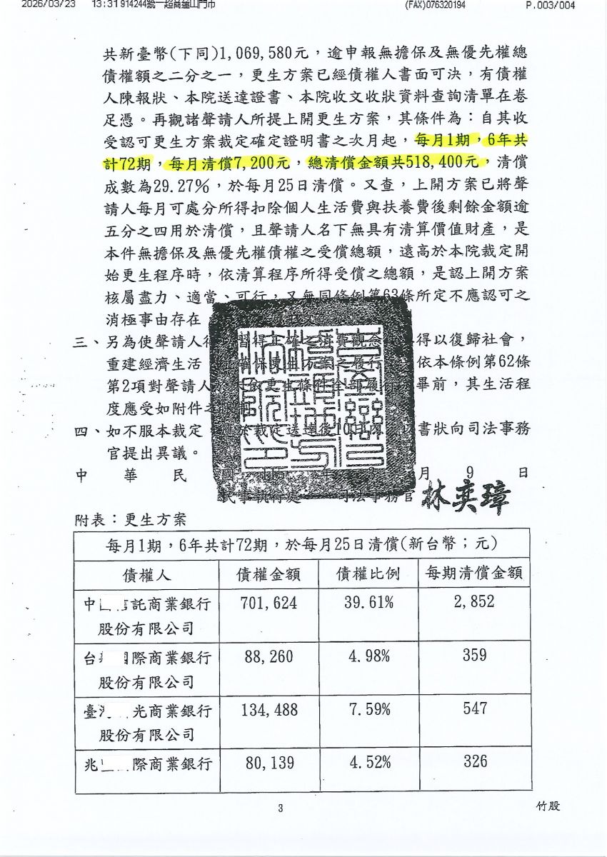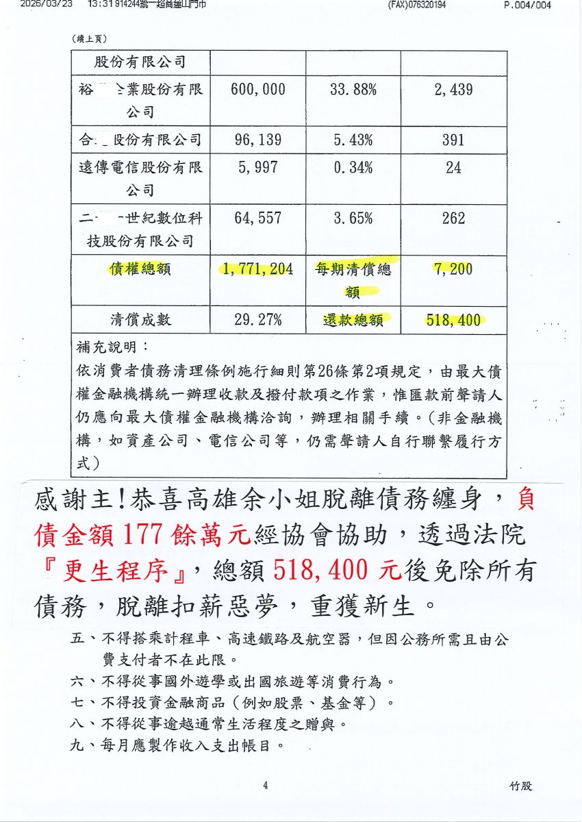 狂賀本會會員 余小姐 經法院裁定更生方案認可確定,以518,400元