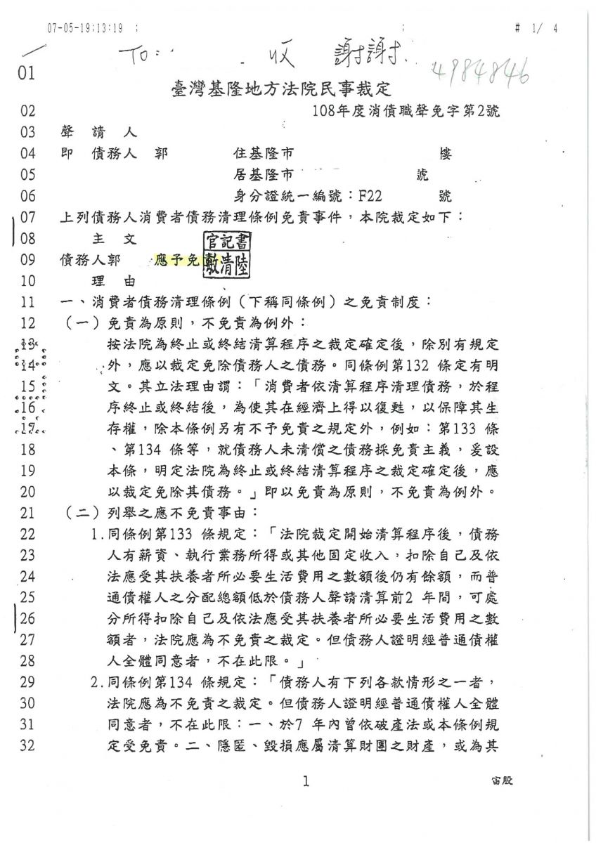 清算免責成功-基隆地方法院-108年度消債職聲免字第2號 清算免責成功-基隆地院-108年度消債職聲免字第2號狂賀本會會員郭小姐經基隆地院裁定清算免責,因債務人符合法條規定 僅還37.383元(財產價值)後免除所有債務 透過協會協助清算免責成功,免除498萬餘元債務 回上頁